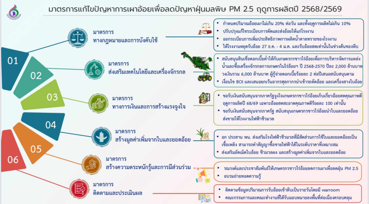- มาตรการแก้ไขปัญหาการเผาอ้อยเพื่อลดปัญหาฝุ่นมลพิษ PM 2.5 ฤดูการผลิตปี 2568/2569